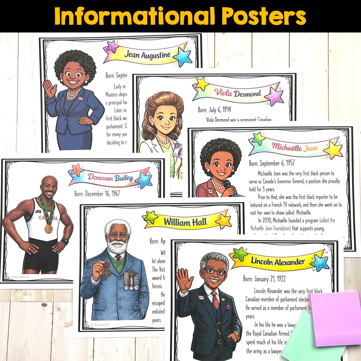 6 Coloured Informational Posters of important Canadian Black Figures in our nation's history.