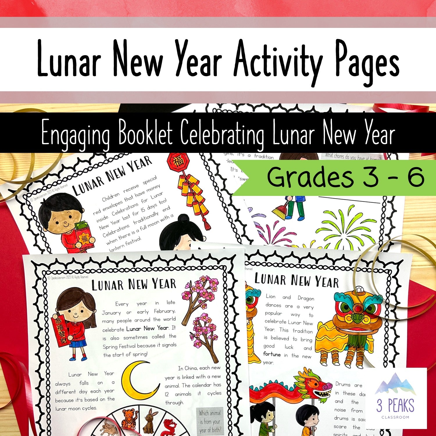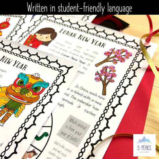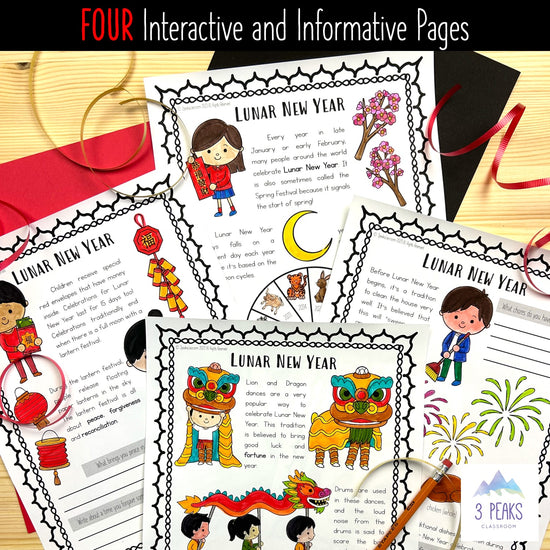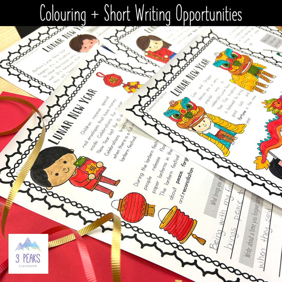 Each pages has colouring opportunities, information about Lunar New Year written in student-friendly language, and engaging/interactive opportunities like fill in the blank, short written response, or circling items.