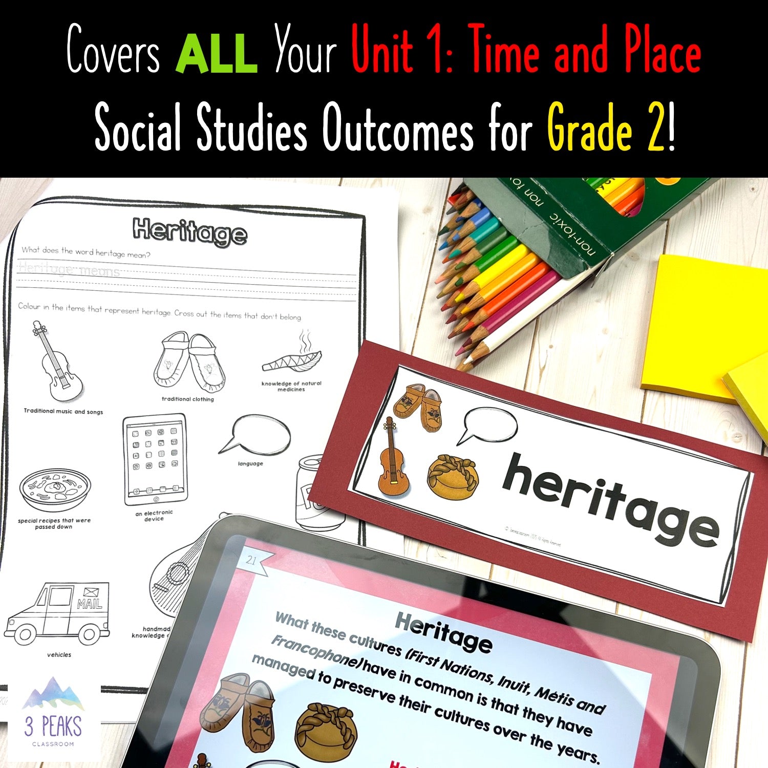 New Alberta Grade 2 Social Studies Curriculum: Unit 1 - Time and Place Teaching Slides and Student Workbook.