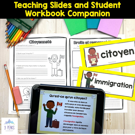 New Alberta Grade 4 FRENCH Social Studies Curriculum: Unit 3 - Citoyennetê/Citizenship: Teaching Slides and Student Workbook.
