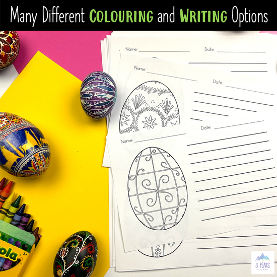 - 3 pages with half writing opportunity with pysanka to colour (for poetry or short writing activities)
